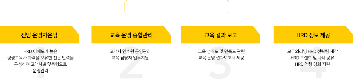 축적된 운영 노하우와 전문성을 갖춘 운영 전문팀과 교육 업계에서 유일하게 HRD 원격훈련기관 전문 고객만족센터(콜센터)를 통해 고객사 및 수강생에게